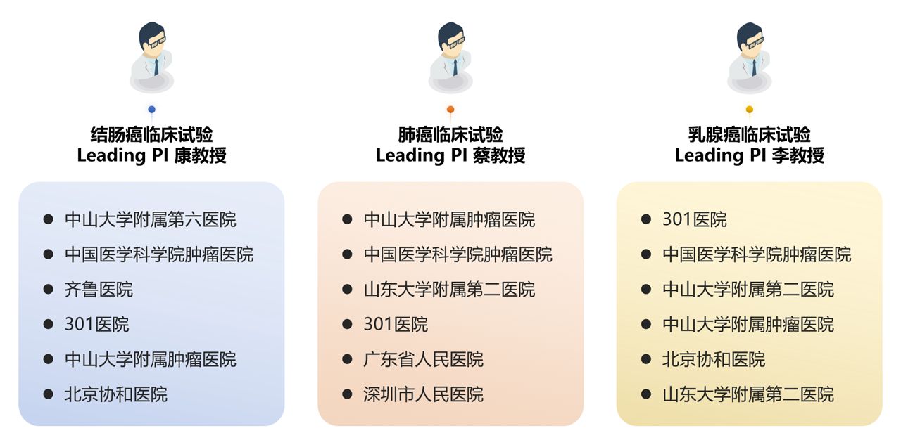 - 合作医院涵盖了国内顶尖的肿瘤治疗与研究机构,由多位知名专家作为Leading PI领导临床试验。结肠癌研究由康教授牵头,主要合作单位包括全球接诊量最大的中山大学附属第六医院、中国医学科学院肿瘤医院、齐鲁医院等;肺癌试验由蔡教授负责,合作方有中山大学附属肿瘤医院、广东省人民医院等;乳腺癌领域由李教授领衔,合作医院涵盖301医院、北京协和医院、中山大学系医院等多所权威机构。这些合作体现了项目在重大癌种临床研究方面的广泛布局和资源整合能力。