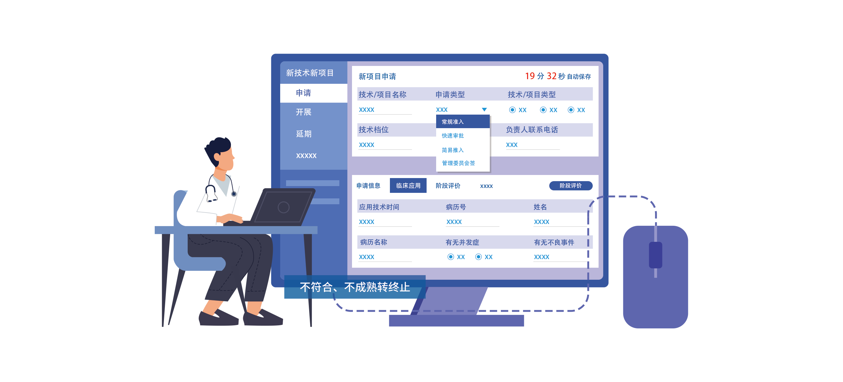 科进医务系统提供闭环式新技术新项目新业务监管模式,强化质量安全管理与评估,涵盖申请准入管理、临床应用记录(包括病例数、适应证掌握情况、效果、并发症、不良反应)、 疗效追踪管理以及终止情况管理,医务科可根据实施情况开展动态评估,评估重点为新技术新项目新业务的质量安全情况和技术保证能力,评估结果可用于及时调整医院新技术新项目新业务的开展和监管,对临床应用过程中出现问题或医疗条件不成熟的可转终止。