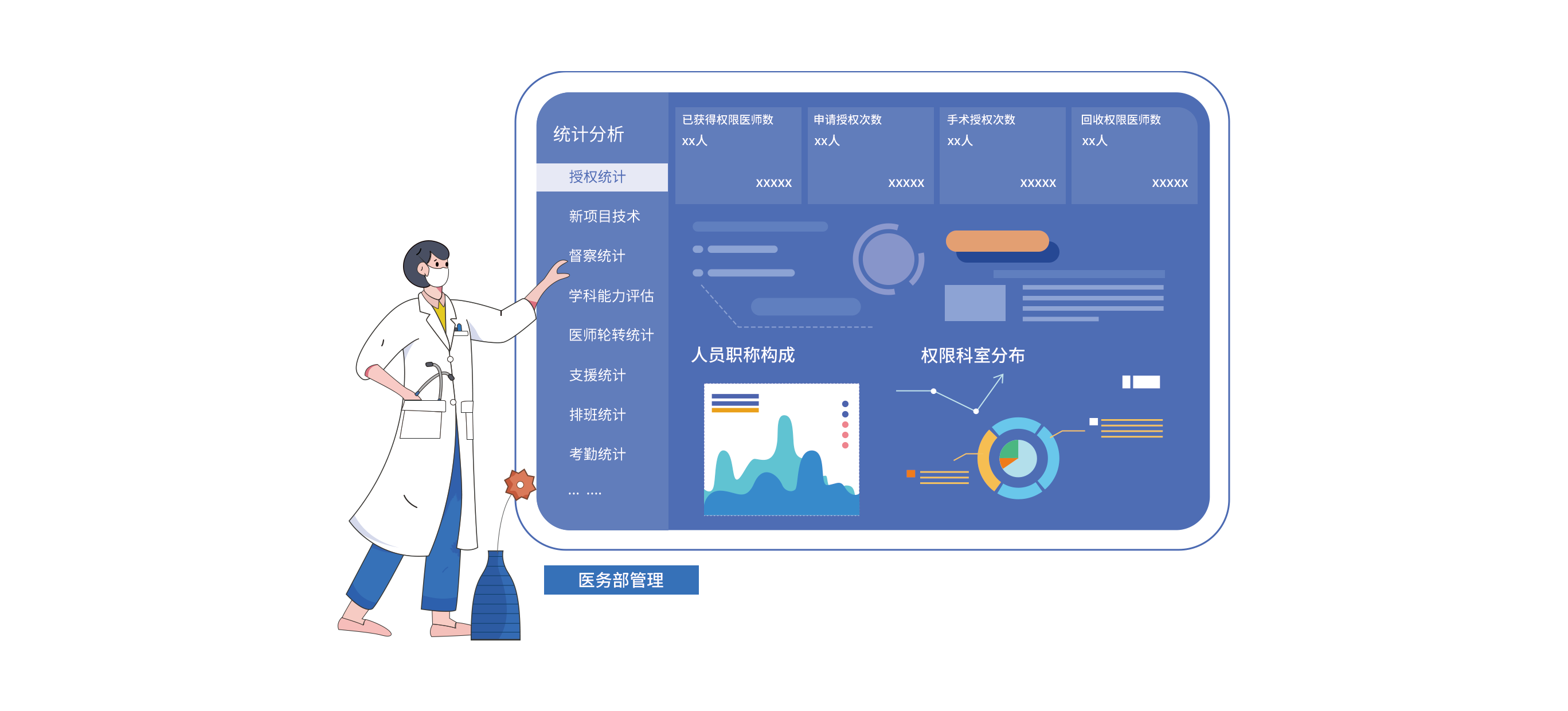 通过信息化手段,科进医务系统推动医务部对医院各科室医师集中式管控和业务协同配合,涵盖“学科能力评估分析、全院医师动态管理、医师个人工作量、科室工作量”,管理部门可在系统中实时了解全院医师动态,查看门急诊人次、出院患者平均住院日等业务信息,同时以多种可视化图表形式展现各科室医生等级、职称、学历、科员占比等内容,为医院后续专科能力水平建设提供有力依据。
