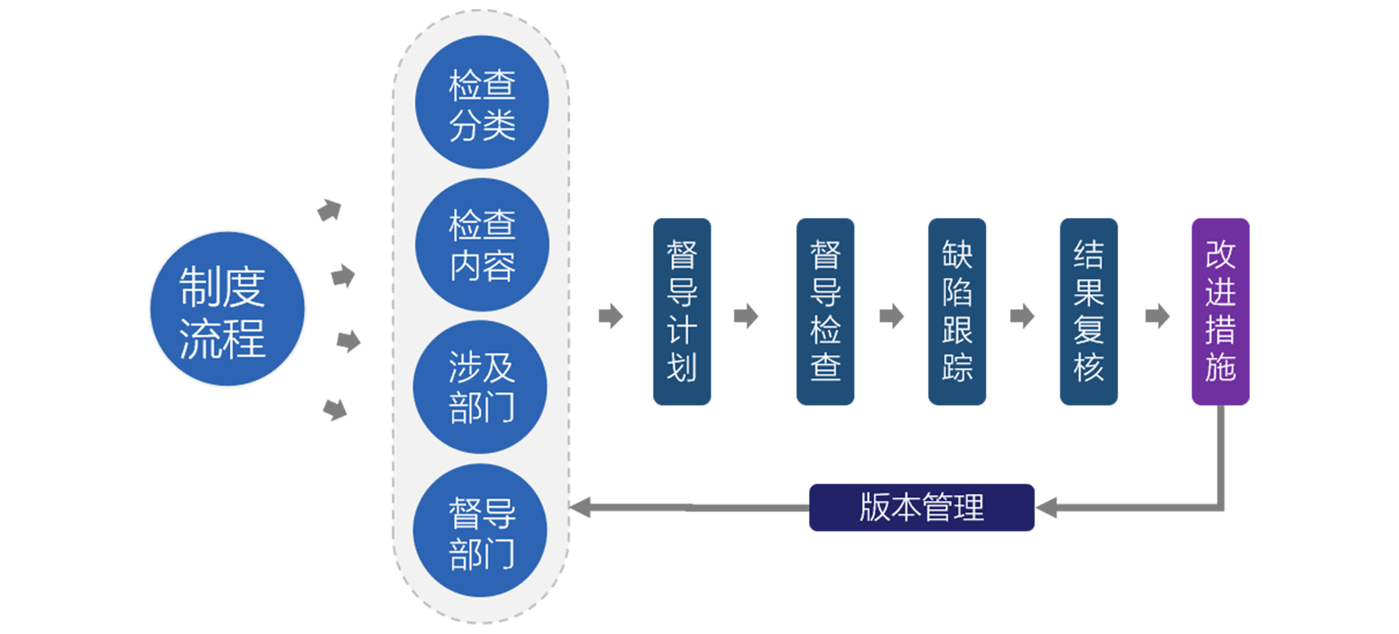 - 制定督导流程,检查分类、检查内容、涉及部门和督导部门进行督导计划、督导检查、缺陷跟踪、结果复核、改进措施在流转到督导部门进行审核。