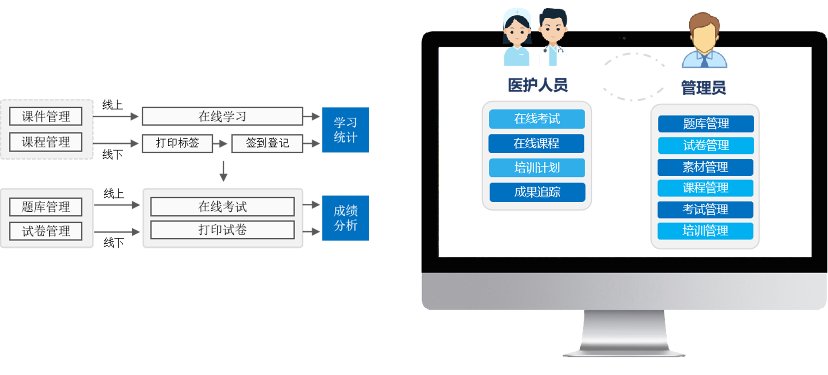 - ①集在线学习、考试、管理为一体,实现线上、线下培训以及考试全场景覆盖 ②构建医院培训与考试业务闭环,实现医院培训考试多维度管理 ③支持丰富题型,简单快速发起考试 ④支持 试卷按需组合,自动批阅,考试成果可追踪 ⑤支持移动端,学员可随时随地学习课程、参与考试。课程、考试、活动消息实时推送,及时掌握最新学习动态。